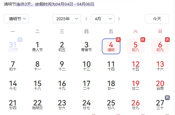 根據國家2025年春節放假通知并結合本司實際情況,放假做以下調整:1、放假時間:2025年4月4日至2025年4月6號,共3天,3月7號正常上···